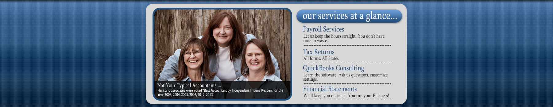AlaneI started working for Hurt & Associates, Inc in 1984. I continued my employment with Hurt & Associates, Inc when Sue Bentley purchased the firm. Luckily, when Sue purchased the business, her first business decision was to keep the tradition of closing at noon on Wednesday’s. My specialized areas include sales tax, highway use tax, payroll and bookkeeping. |